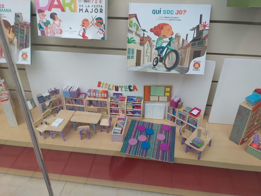 Magnífic aparador de la llibreria la Mulassa de Vilanova, amb els llibres il·lustrats per Sebastià Serra i també s'exposa una gran obra de maquetaria del mateix autor.